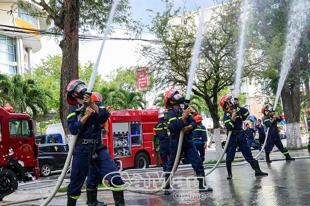 Đội PCCC &CNCH khách sạn Cosmo Stars Bạc Liêu chữa cháy bằng vòi nước.