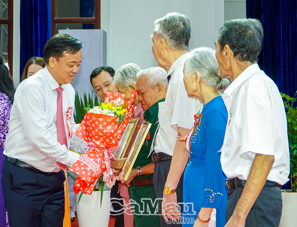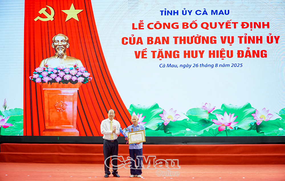 Phó Bí thư Thường trực Tỉnh uỷ Huỳnh Quốc Việt trao Huy hiệu Đảng cho đảng viên cao niên tại buổi lễ.