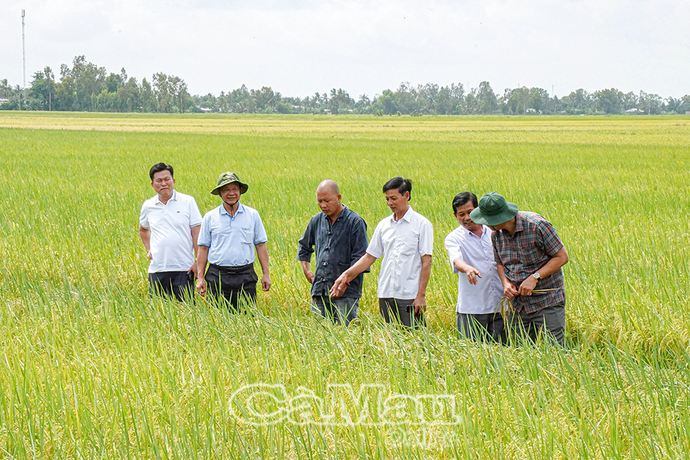 Ông Hồ Trung Việt, Trưởng Ban Tuyên giáo và Dân vận Tỉnh uỷ Cà Mau (thứ 2, bên trái), tìm hiểu mô hình lúa hữu cơ tại phường Láng Tròn.