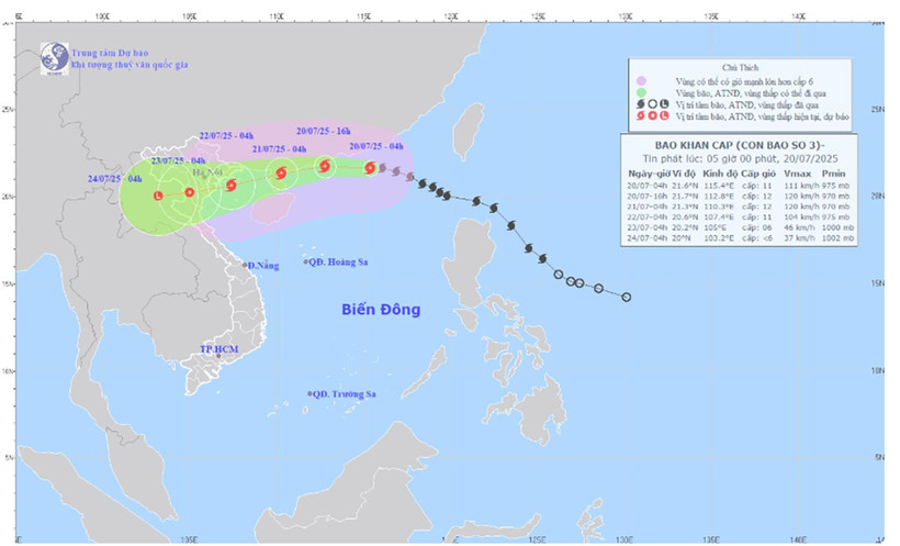 Bản đồ dự báo đường đi và cường độ bão số 3 phát lúc 5 giờ ngày 20/7. (Ảnh: Trung tâm Dự báo khí tượng thủy văn quốc gia)