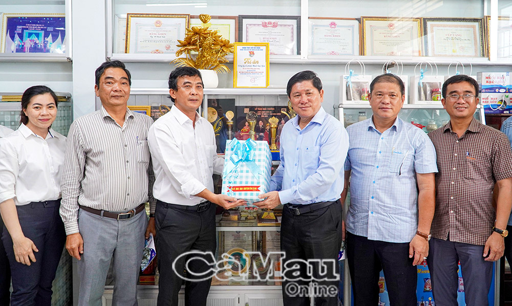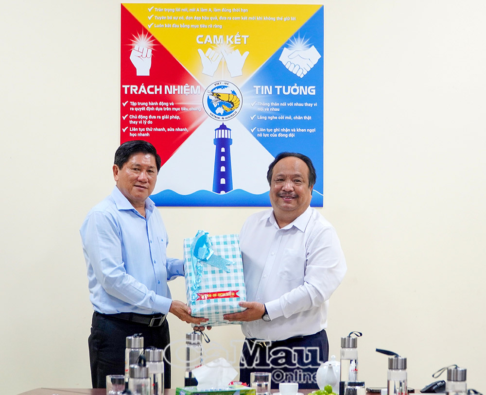 Đồng chí Lê Văn Sử tặng quà cho lãnh đạo Công ty TNHH GROWMAX Cà Mau.