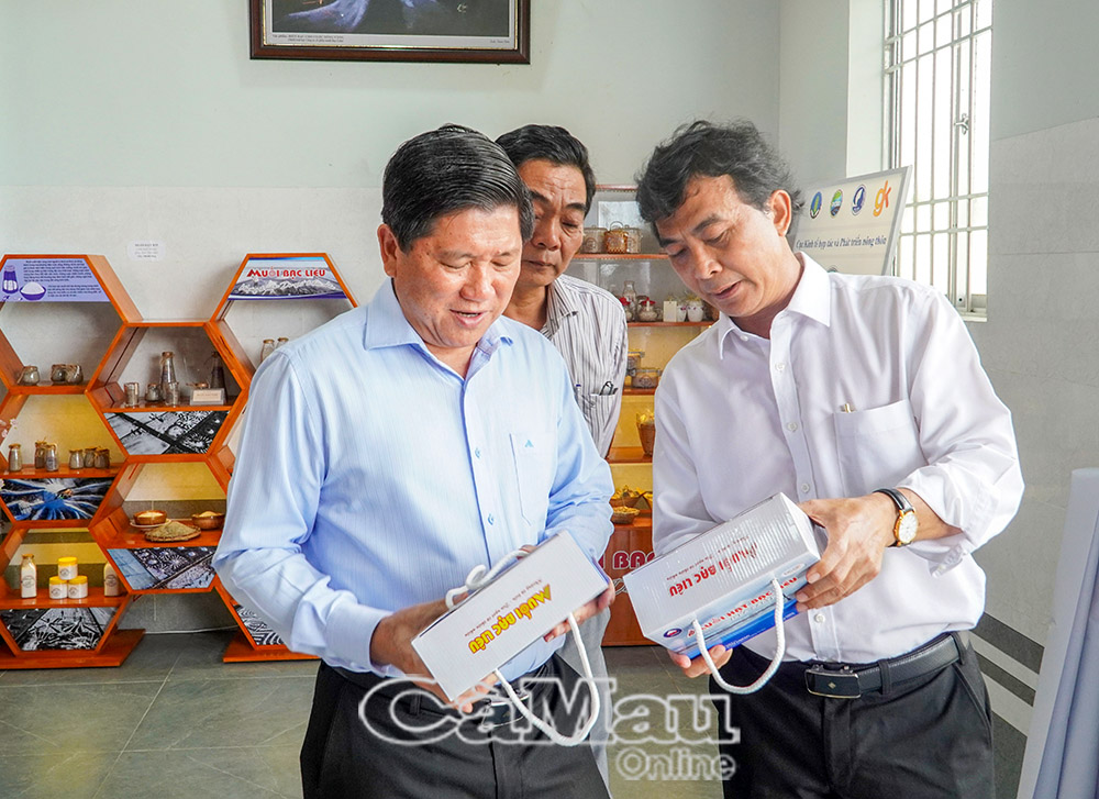Đồng chí Lê Văn Sử tham quan các sản phẩm của Công ty Cổ phần Muối Bạc Liêu.