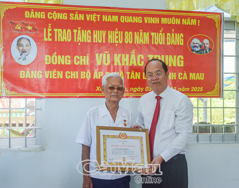 Đợt 7/11/2025, Ban Thường vụ Tỉnh uỷ Cà Mau trao tặng Huy hiệu Đảng cho 371 đảng viên và truy tặng Huy hiệu Đảng cho 7 đảng viên. Huy hiệu Đảng là phần thưởng cao quý của Đảng nhằm ghi nhận, tôn vinh những đảng viên có quá trình cống hiến, lập nhiều thành tích trong sự nghiệp đấu tranh giải phóng dân tộc, xây dựng và bảo vệ Tổ quốc; luôn giữ vững bản lĩnh chính trị, gương mẫu trong lối sống, hoàn thành xuất sắc nhiệm vụ của người đảng viên.