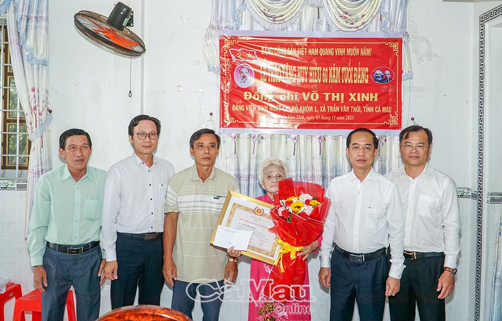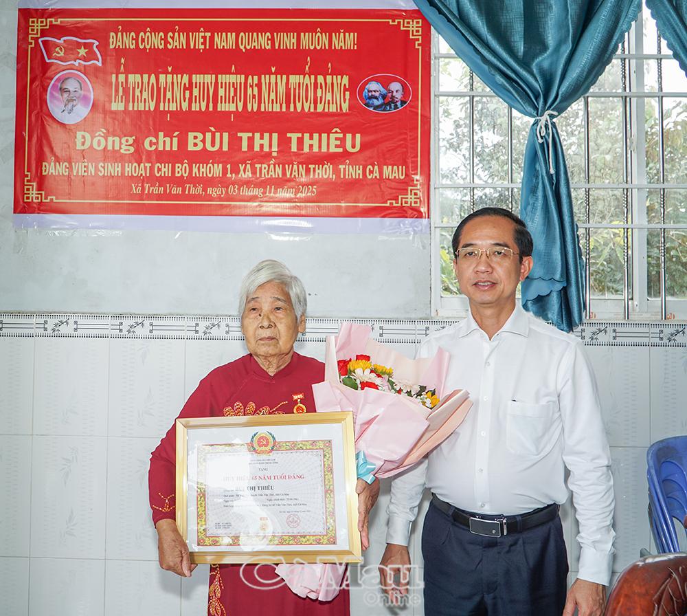 Tại xã Trần Văn Thời, đoàn đã trao Huy hiệu 65 năm tuổi Đảng cho đảng viên Bùi Thị Thiêu (sinh năm 1940, sinh hoạt tại Chi bộ Khóm 1); Huy hiệu 60 năm tuổi Đảng cho đảng viên Võ Thị Xinh (sinh năm 1944, Chi bộ Khóm 1); và đảng viên Nguyễn Văn Dũng (sinh năm 1938, sinh hoạt Chi bộ ấp Mũi Tràm B, xã Đá Bạc).