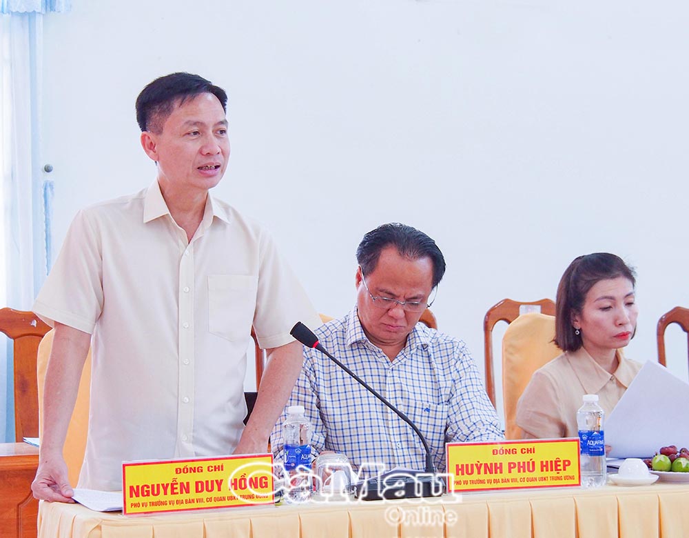 Tham dự buổi làm việc có đồng chí Hồ Thanh Thuỷ, Phó Bí thư Tỉnh uỷ; đồng chí Lâm Văn Bi, Uỷ viên Ban Thường vụ Tỉnh uỷ, Phó Chủ tịch UBND tỉnh; đồng chí Huỳnh Hữu Trí, Uỷ viên Ban Thường vụ Tỉnh uỷ, Chủ nhiệm Uỷ ban Kiểm tra Tỉnh uỷ; cùng đại diện lãnh đạo Vụ Địa bàn VIII, các sở, ngành tỉnh và xã Đất Mũi.