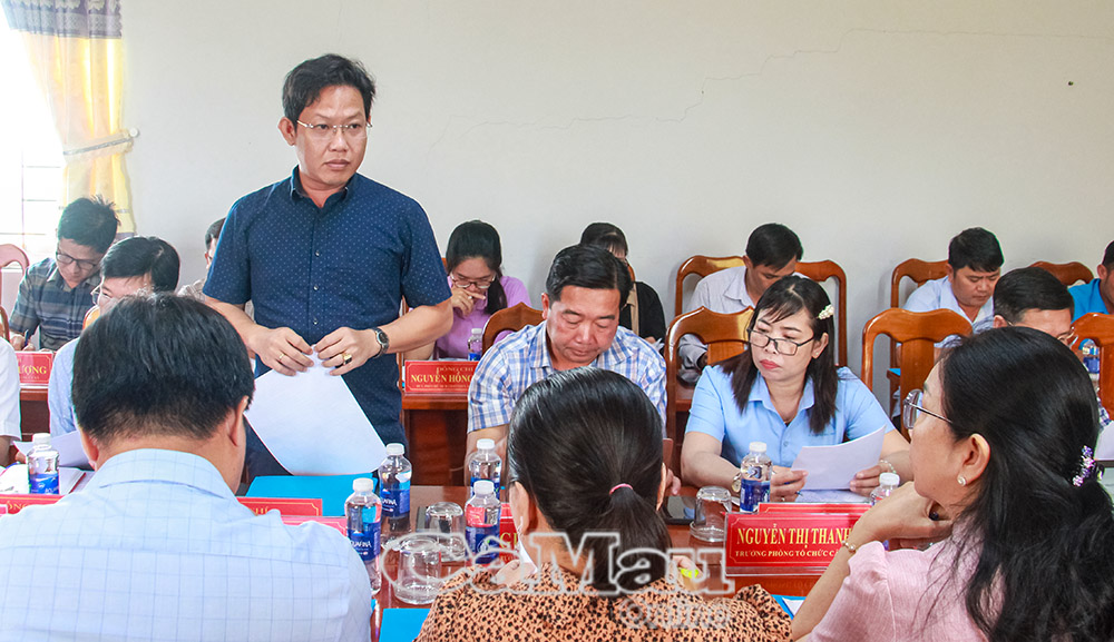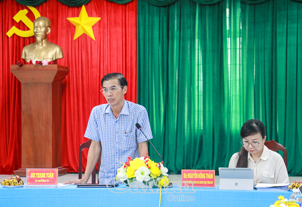 Đồng chí Nguyễn Hồng Thắm, Phó Trưởng Ban Tuyên giáo và Dân vận Tỉnh uỷ, triển khai nội dung kiểm tra với Đảng uỷ xã Khánh Hưng.