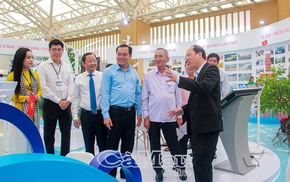 Lãnh đạo tỉnh tham quan và động viên cán bộ, nhân viên Cà Mau tham gia Triển lãm thành tựu đất nước.
