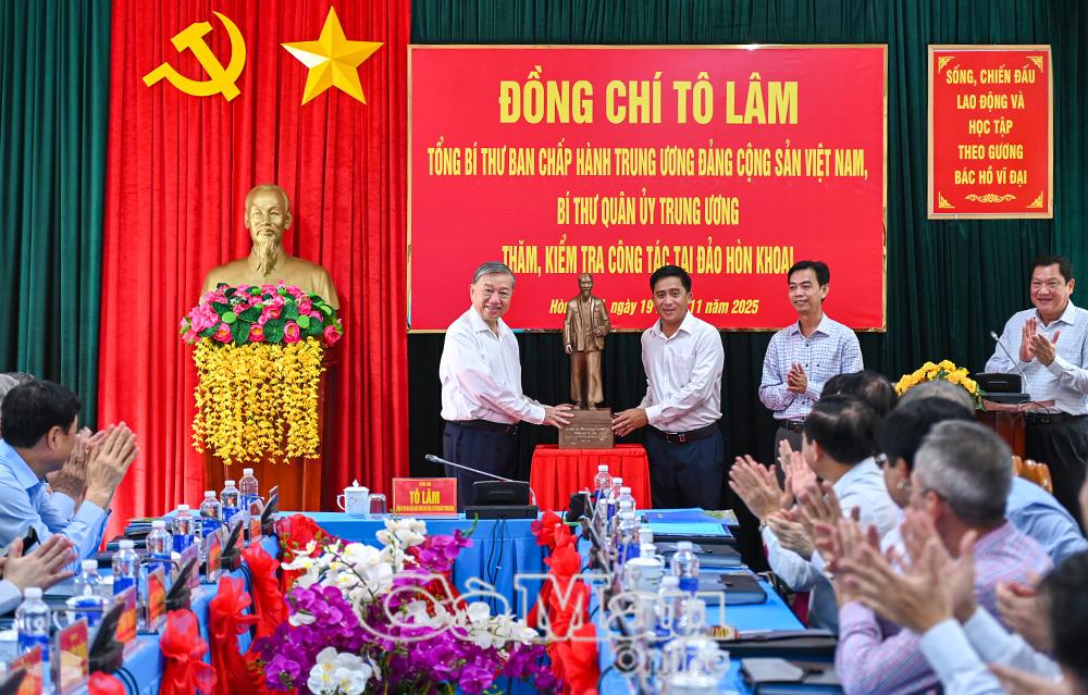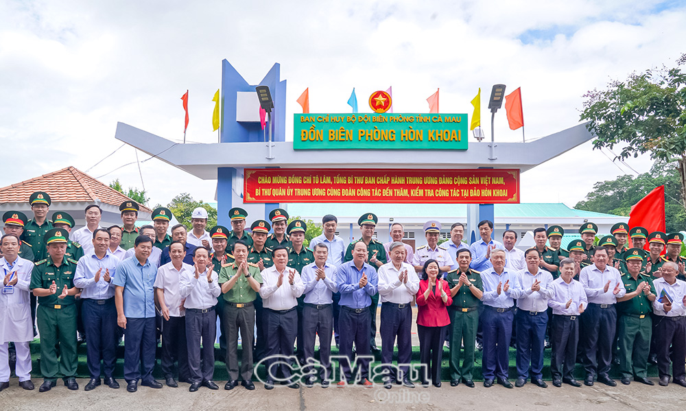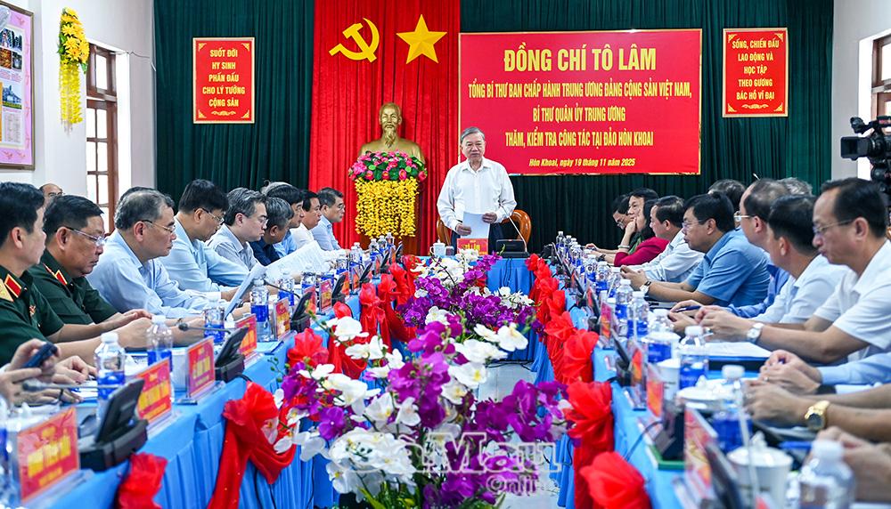 Sáng 19/11, Tổng Bí thư Tô Lâm cùng đoàn công tác Trung ương đến thăm cán bộ, chiến sĩ các đơn vị làm nhiệm vụ trên đảo Hòn Khoai, đồng thời khảo sát tiến độ 2 dự án đường giao thông ra đảo và cảng tổng hợp lưỡng dụng tại cụm đảo Hòn Khoai; sau đó có buổi làm việc với lãnh đạo tỉnh Cà Mau tại Đồn Biên phòng Hòn Khoai.