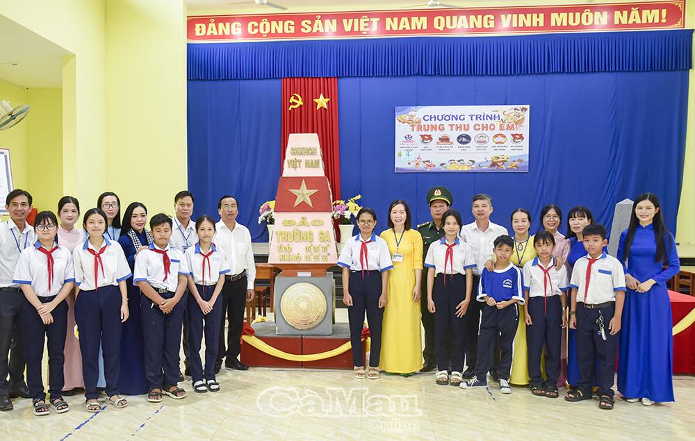 Cán bộ các đơn vị và học sinh chụp hình lưu niệm với cột mốc chủ quyền Trường Sa.