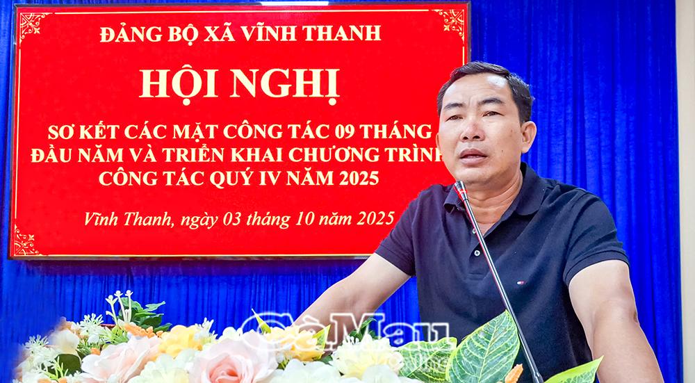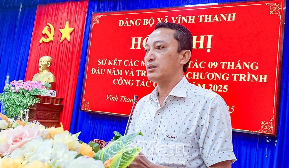 Ngày 3/10, Đảng uỷ xã Vĩnh Thanh tổ chức Hội nghị sơ kết 9 tháng đầu năm, triển khai nhiệm vụ quý IV/2025. Phó Chủ tịch UBND tỉnh Huỳnh Hữu Trí dự và phát biểu chỉ đạo tại hội nghị.