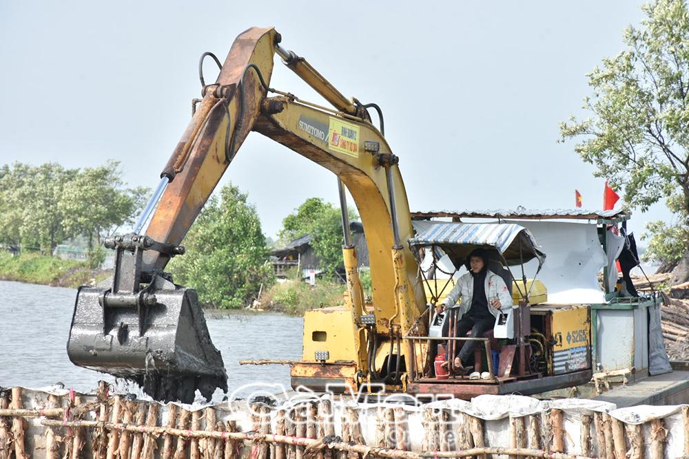 Đơn vị thi công tiến hành đắp taluy để bơm cát phục vụ công trình.