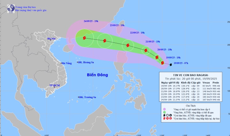 Trung tâm Dự báo khí tượng thủy văn Quốc gia cho biết thêm, vào hồi 19 giờ ngày 19/9, vị trí tâm bão số 9 Ragasa ở cách đảo Lu-Dông (Philippin) khoảng 820km về phía Đông. Sức gió mạnh nhất vùng gần tâm bão mạnh cấp 9 (75-88km/giờ), giật cấp 11. Di chuyển theo hướng Tây Tây Bắc với tốc độ khoảng 15km/h.