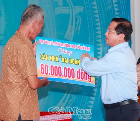 Đồng chí Lê Thanh Triều, Phó Chủ tịch Thường trực Uỷ ban MTTQ Việt Nam tỉnh, trao bảng tượng trưng tặng nhà Đại đoàn kết cho hộ ông Dương Hoàng Nam, gia đình chính sách ở ấp Bửu 2, xã Đông Hải, ngày 1/11/2025.