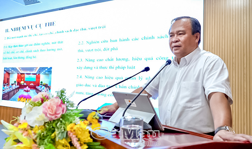 Đồng chí Nguyễn Minh Luân báo cáo 02 nội dung tại hội nghị: Nghị quyết số 281 của Chính phủ và Kế hoạch số 0188 của UBND tỉnh Cà Mau.