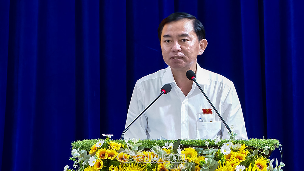 Đồng chí Phan Thanh Duy, Trưởng Ban Tổ chức Tỉnh uỷ, làm rõ những nội dung cử tri xã Hoà Bình quan tâm, liên quan tình trạng ngập úng cục bộ, đầu tư hạ tầng, chế độ chính sách và an sinh xã hội.