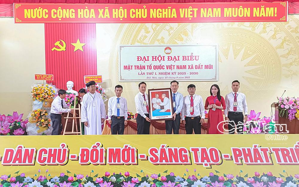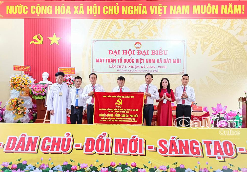 Đảng uỷ xã trao bức trướng mang dòng chữ: “Đoàn kết - Dân chủ - Đổi mới - Sáng tạo - Phát triển”, với mục tiêu “Phát huy sức mạnh đại đoàn kết toàn dân tộc, xây dựng xã Đất Mũi phát triển nhanh và bền vững”.