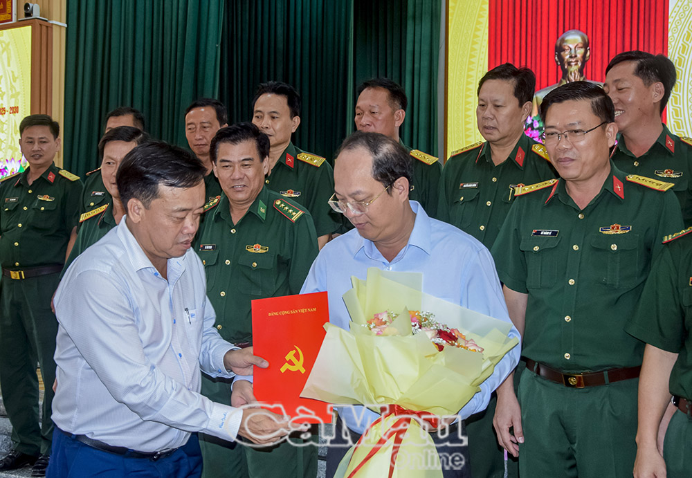 Đại tá Võ Thành Lê, Chính uỷ Bộ Chỉ huy Quân sự tỉnh, trao các quyết định và tặng hoa cho các đồng chí giữ các chức vụ ở các tổ chức cơ sở Đảng trực thuộc Đảng bộ Quân sự tỉnh.