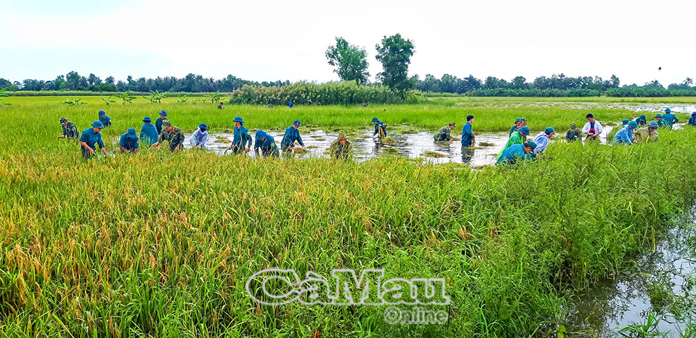 LLVT tỉnh giúp hân dân xã Khánh Bình thu hoạch lúa, nhanh chóng ổn định cuộc sống sau đợt mưa, bão.
