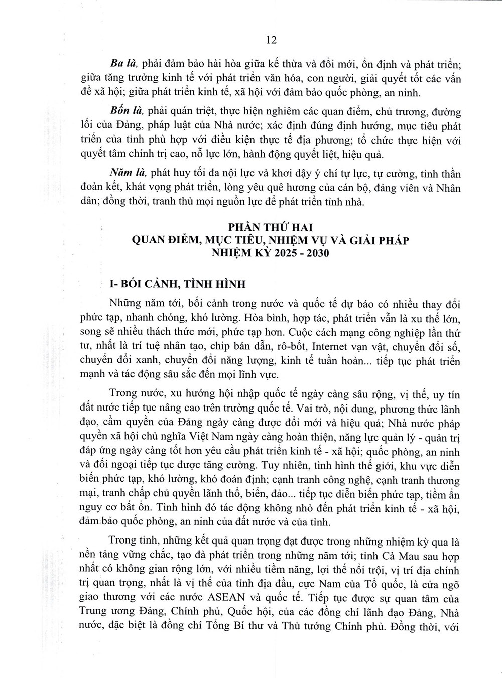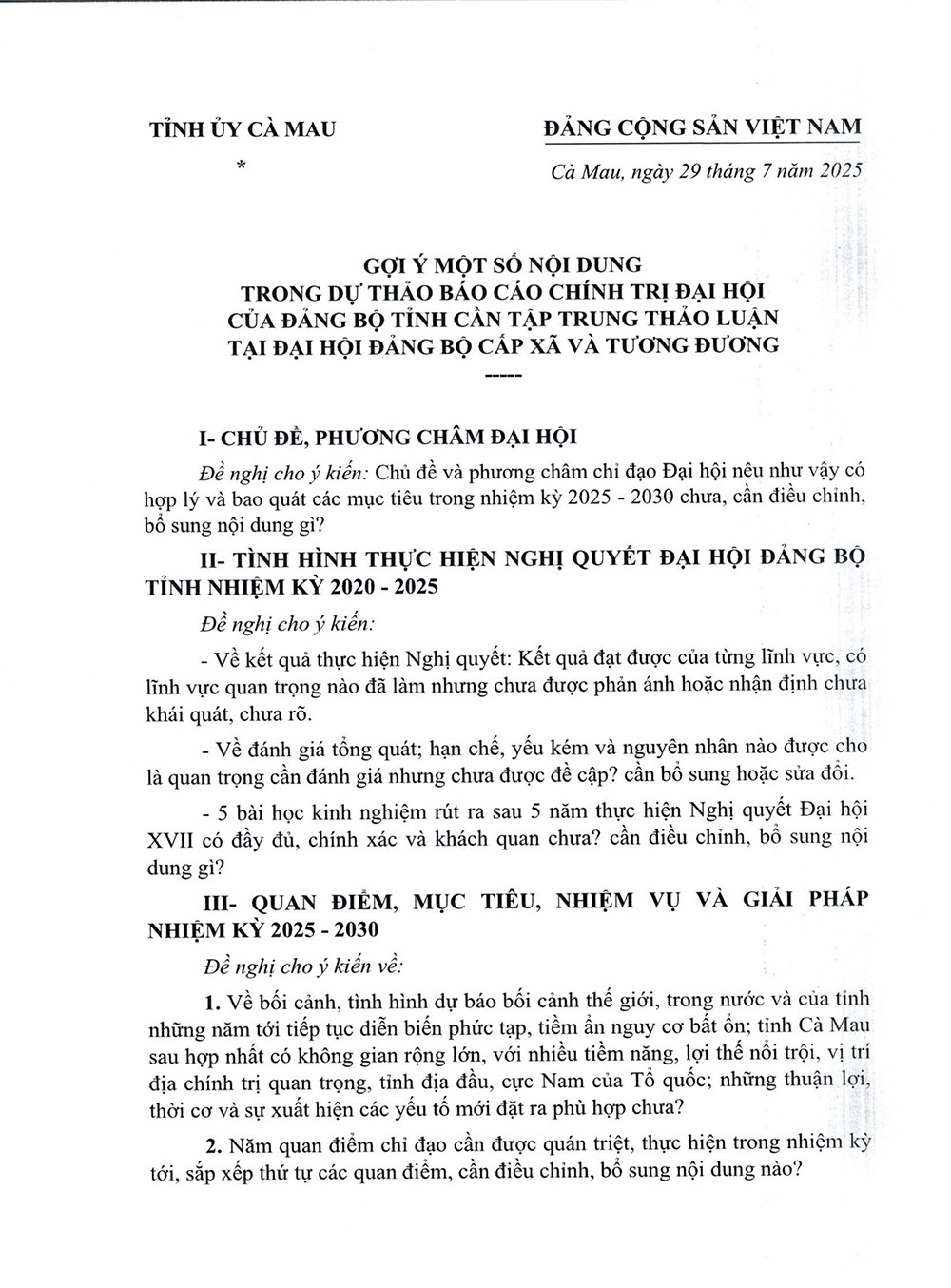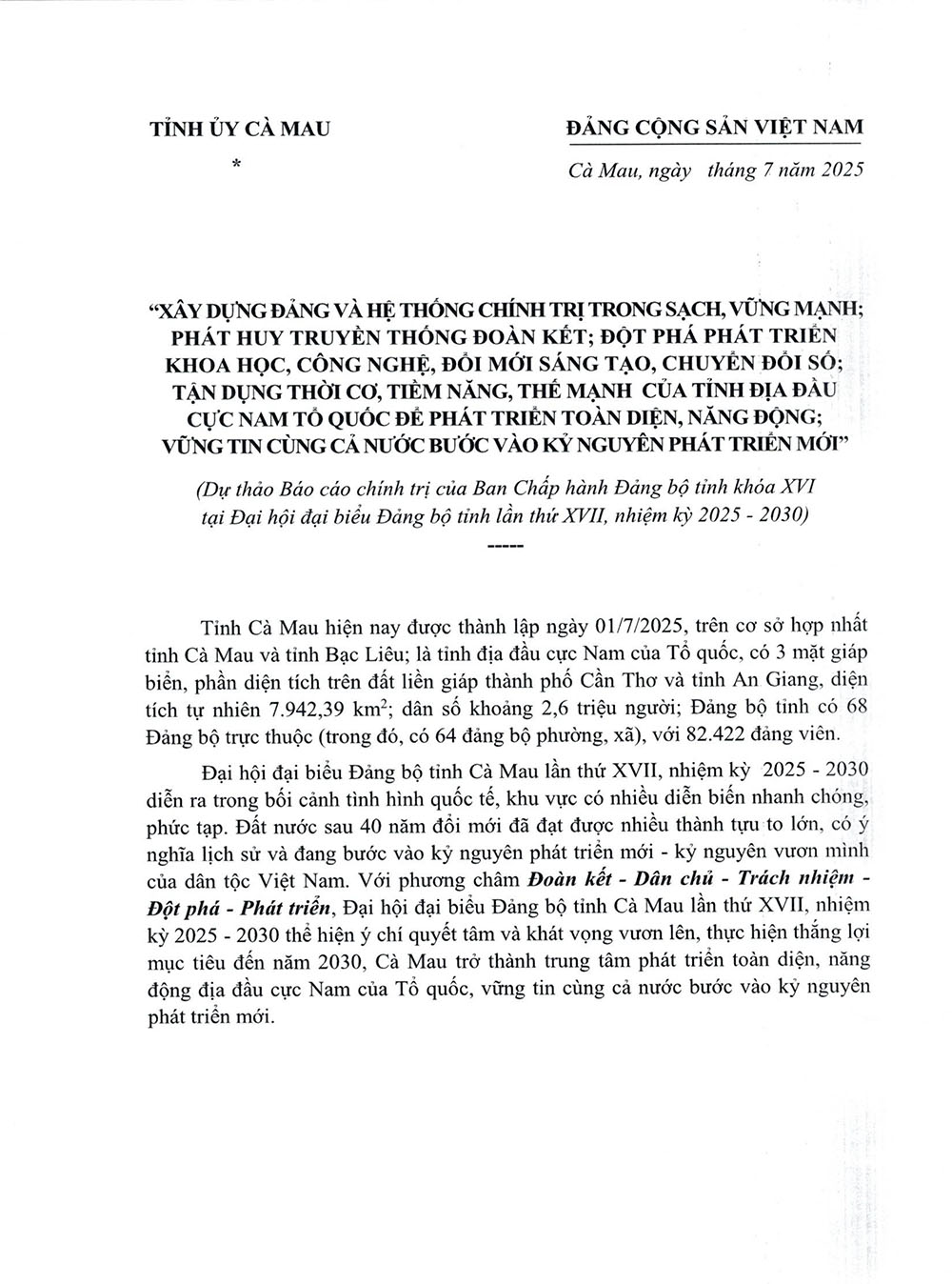 Báo Cà Mau Online trân trọng giới thiệu toàn văn Dự thảo Văn kiện trình Đại hội đại biểu Đảng bộ tỉnh nhiệm kỳ 2025 – 2030 để cán bộ, đảng viên và Nhân dân đóng góp ý kiến.