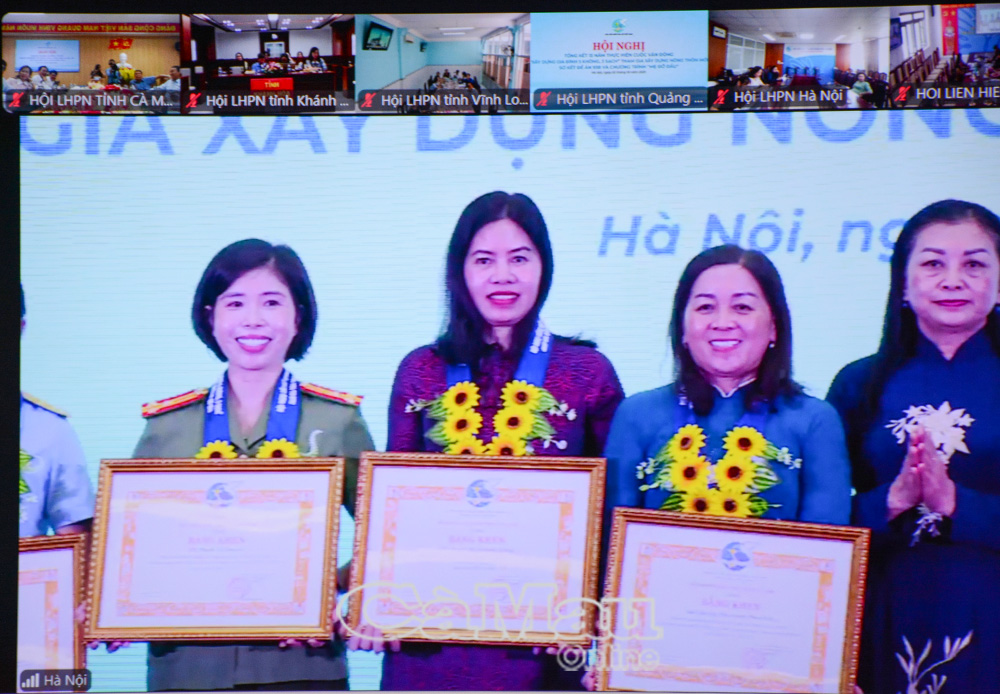 Bà Tô Thị Mỹ Thuận, Phó Chủ tịch Thường trực Hội LHPN tỉnh Cà Mau (thứ 2 từ trái sang), đại diện Hội nhận Bằng khen của Trung ương Hội về thành tích 15 năm thực hiện Cuộc vận động “Xây dựng gia đình 5 không, 3 sạch” gắn với xây dựng nông thôn mới. (Ảnh chụp màn hình)