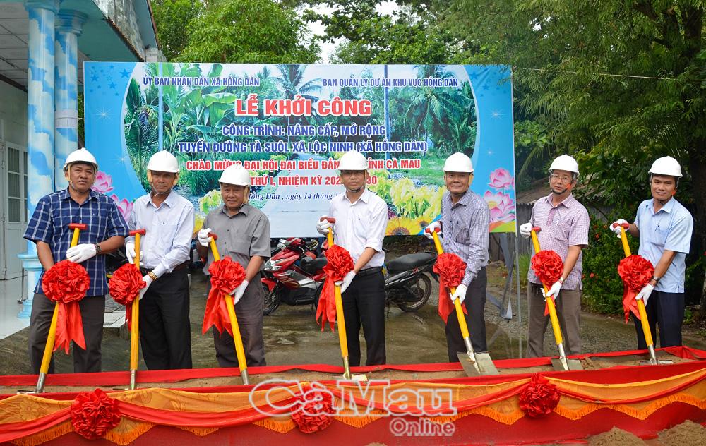 Lãnh đạo Đảng uỷ, HĐND, UBND, Uỷ ban MTTQ xã Hồng Dân thực hiện nghi thức khởi công tuyến đường.