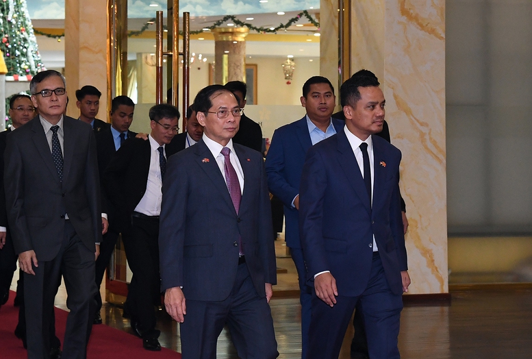 Phó Thủ tướng Bùi Thanh Sơn và Phó Thủ tướng, Bộ trưởng Bộ Nội vụ Campuchia Sar Sokha bày tỏ vui mừng về sự phát triển mạnh mẽ của quan hệ Việt Nam-Campuchia thời gian qua - Ảnh: VGP/Hải Minh