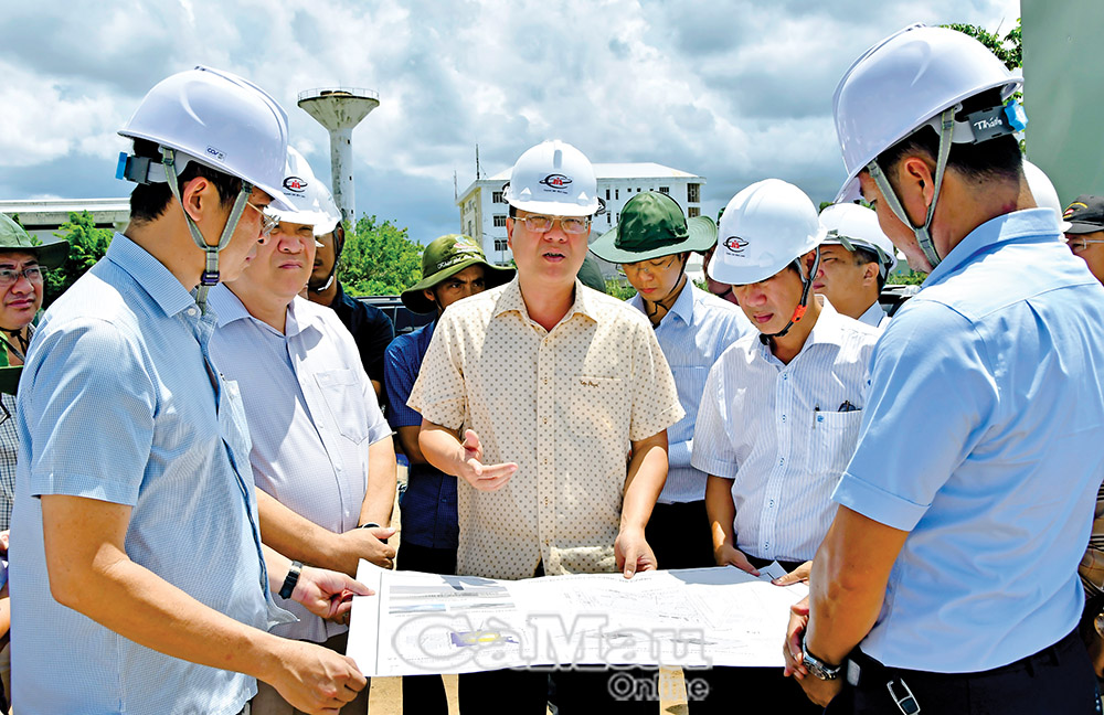 Ðồng chí Nguyễn Hồ Hải, Bí thư Tỉnh uỷ (giữa) và đồng chí Phạm Thành Ngại, Phó Bí thư Tỉnh uỷ, Chủ tịch UBND tỉnh (thứ hai từ trái sang) khảo sát, nắm tình hình nhằm đưa ra định hướng chiến lược phát triển hệ thống cảng gắn liền với Khu Kinh tế Năm Căn (xã Năm Căn).