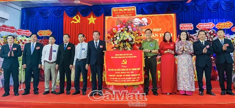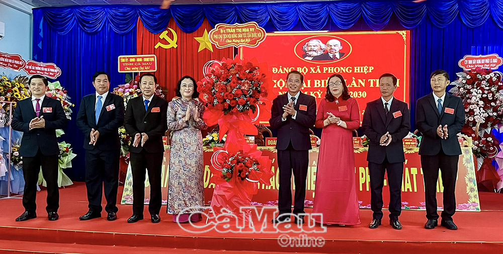 Thay mặt Ban Chấp hành Đảng bộ tỉnh Cà Mau, Đại tá Hồ Việt Triều trao tặng Ban Chấp hành Đảng bộ xã Phong Hiệp bức trướng chúc mừng đại hội.