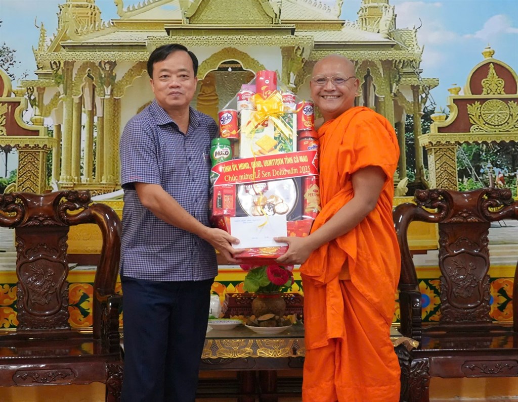 Dịp này, thay mặt lãnh đạo tỉnh, Phó Bí thư Thường trực Tỉnh ủy, Chủ tịch UB MTTQ Việt Nam tỉnh Huỳnh Quốc Việt tặng quà cho các hòa thượng, đại đức, Ban Quản trị, Ban Hoằng pháp các chùa và chúc các vị hòa thượng, đại đức, chư tăng, người có uy tín, đồng bào phật tử Khmer đón lễ Sen Đolta năm 2025 an vui, đầm ấm.