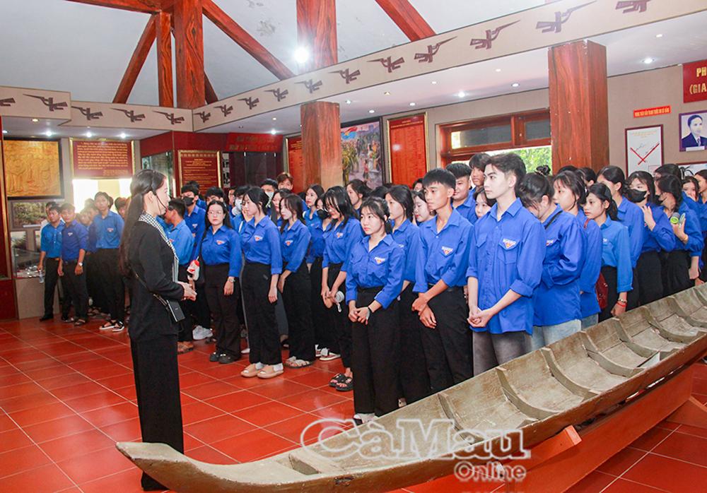 Đoàn viên, thanh niên Trường THPT Ninh Thạnh Lợi lắng nghe giới thiệu về chiếc xuồng lườn - phương tiện từng được đồng chí Võ Văn Kiệt (sau này là Thủ tướng Chính phủ) sử dụng khi hoạt động tại Căn cứ Cái Chanh.