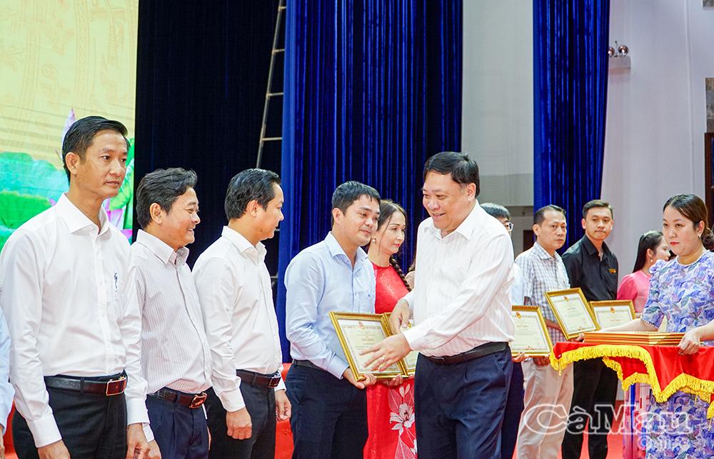 Đồng chí Huỳnh Quốc Việt, Uỷ viên dự khuyết Ban Chấp hành Trung ương Đảng, Phó Bí thư Thường trực Tỉnh uỷ, Chủ tịch Uỷ ban MTTQ Việt Nam tỉnh trao bằng khen của Chủ tịch UBND tỉnh cho các cá nhân có thành tích xuất sắc đóng góp vào thành công Đại hội.