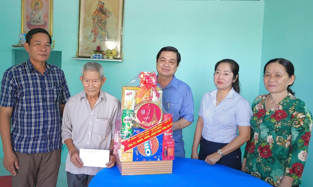 Phó Chủ tịch UBND tỉnh Huỳnh Chí Nguyện (thứ 3 từ phải), thăm, tặng quà cho thương binh Trần Xuân Đấu.