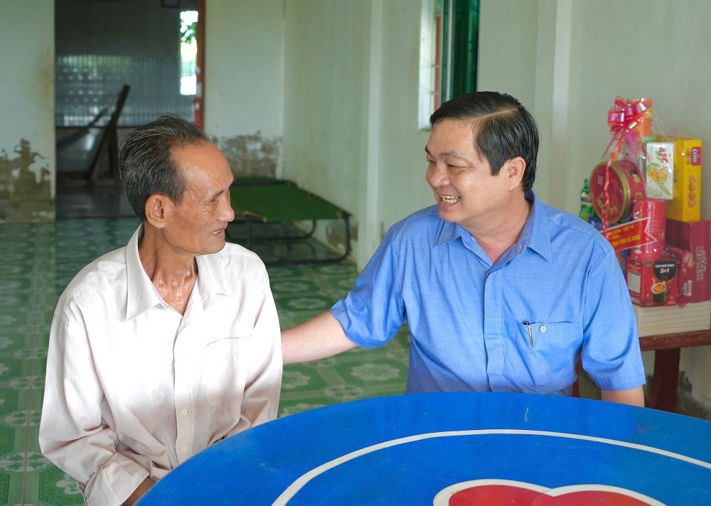 Phó Chủ tịch UBND tỉnh Huỳnh Chí Nguyện (bên phải) thăm hỏi, động viên thương binh Trương Văn Tải.