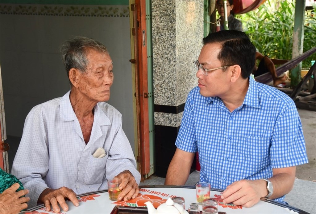 Phó Chủ tịch UBND tỉnh Ngô Vũ Thăng (bên phải) thăm hỏi đời sống thương binh Trần Văn Trăm, ở ấp Chống Mỹ B, xã Năm Căn.