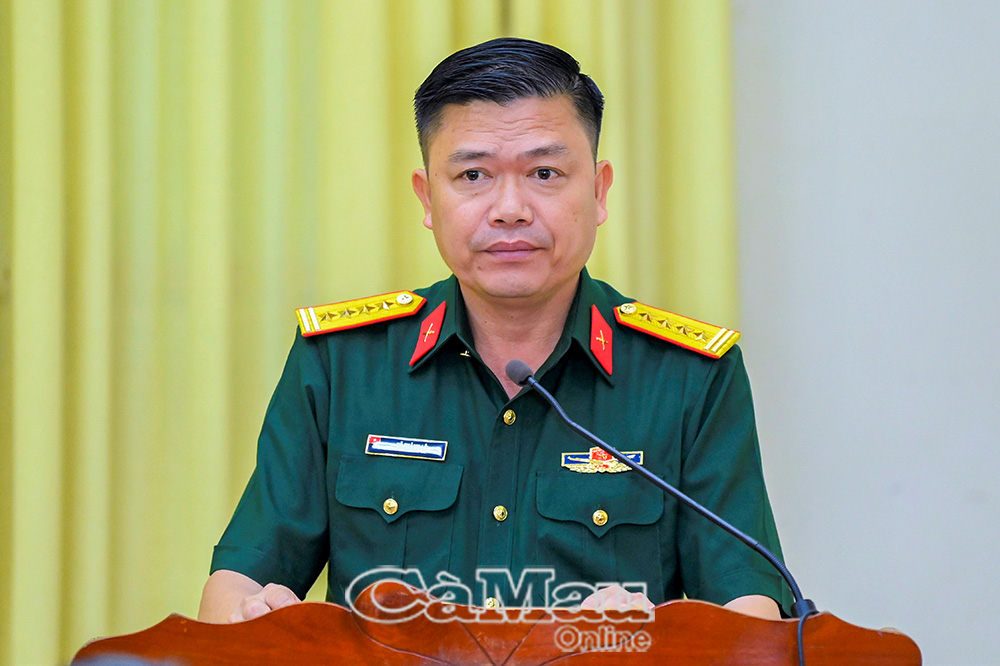 Đại tá Võ Thành Lê, Chính uỷ Bộ CHQS tỉnh, phát biểu chỉ đạo tại hội nghị.