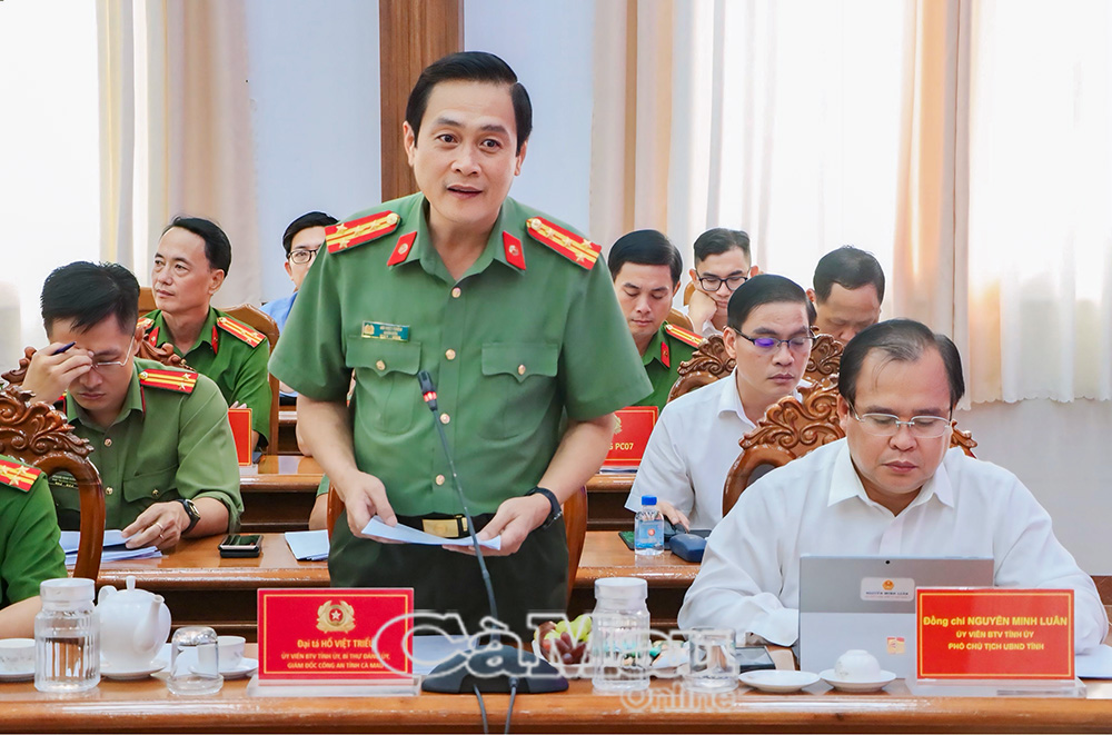 Tại buổi làm việc, Đại tá Hồ Việt Triều, Bí thư Đảng uỷ, Giám đốc Công an tỉnh báo cáo tóm tắt tình hình, kết quả công tác Công an và kết quả thực hiện các chỉ tiêu công tác năm 2025 của Công an tỉnh Cà Mau.