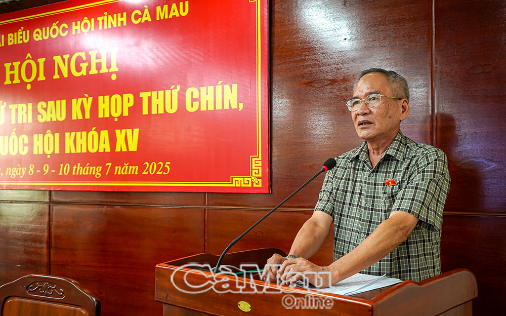 Buổi tiếp xúc ghi nhận 13 ý kiến tâm huyết của cử tri, tập trung vào một số vấn đề đáng quan tâm như: chính sách thuế của Mỹ đối với ngành hàng tôm, lĩnh vực chủ lực của tỉnh Cà Mau; chế độ trợ cấp bảo hiểm thất nghiệp cho người lao động; kiến nghị đầu tư nâng cấp tuyến đường liên xã ven sông Bảy Háp nhằm tạo thuận lợi cho việc đi lại, giao thương của người dân; đồng thời đề xuất có chính sách hỗ trợ phù hợp cho bà con ngư dân trong bối cảnh hoạt động khai thác, sản xuất hiện nay gặp nhiều khó khăn, hiệu quả thấp.
