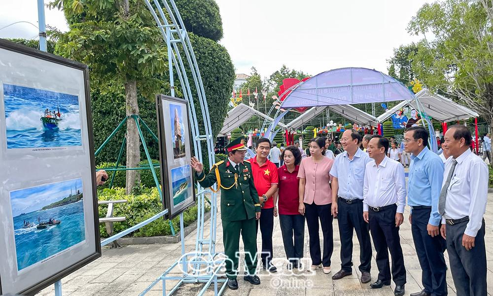 Lãnh đạo tỉnh Cà Mau tham quan Triển lãm Ảnh thời sự - nghệ thuật "Tình yêu biển, đảo quê hương" do Liên hiệp các Hội Văn học Nghệ thuật tỉnh phối hợp tổ chức tại phường Bạc Liêu chiều 21/8/2025. Ảnh: NSNA Phan Thanh Cường