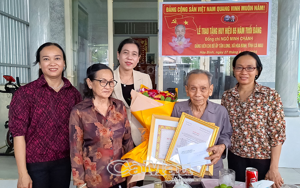 Đồng chí Tô Việt Thu, Uỷ viên Ban Thường vụ Tỉnh uỷ, Bí thư Đảng uỷ phường Bạc Liêu, trao Huy hiệu 65 năm tuổi Đảng cho đồng chí Ngô Minh Chánh,nguyên Tổng Biên tập Báo Minh Hải.