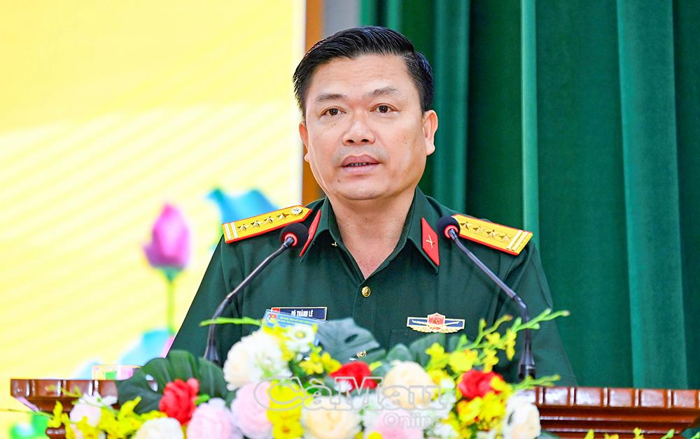 Đại tá Võ Thành Lê, Phó Bí thư Thường trực Đảng uỷ, Chính uỷ Bộ CHQS tỉnh, phát biểu tại hội nghị.