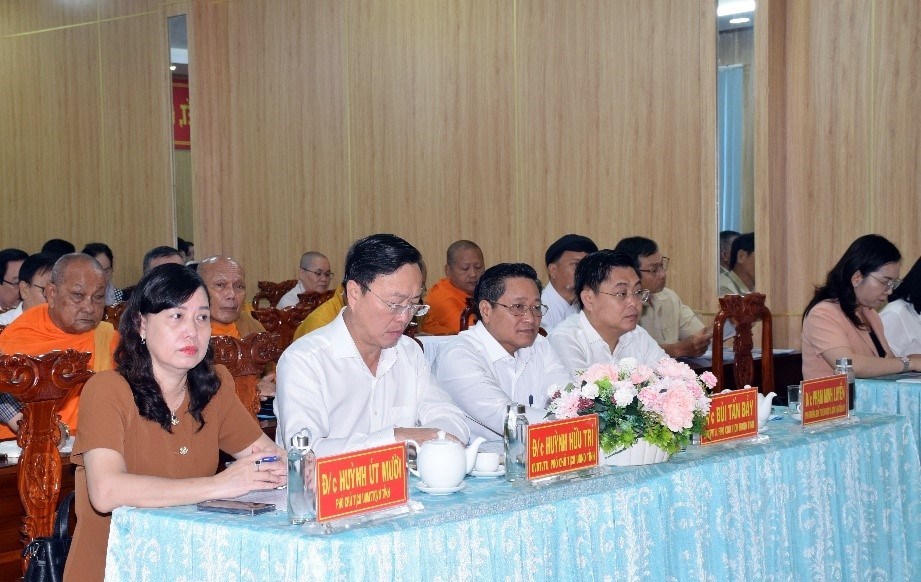 Phó Chủ tịch HĐND tỉnh Bùi Tấn Bảy (thứ 2 từ phải) và Phó Chủ tịch UBND tỉnh Huỳnh Hữu Trí (thứ 2 từ trái) dự hội nghị