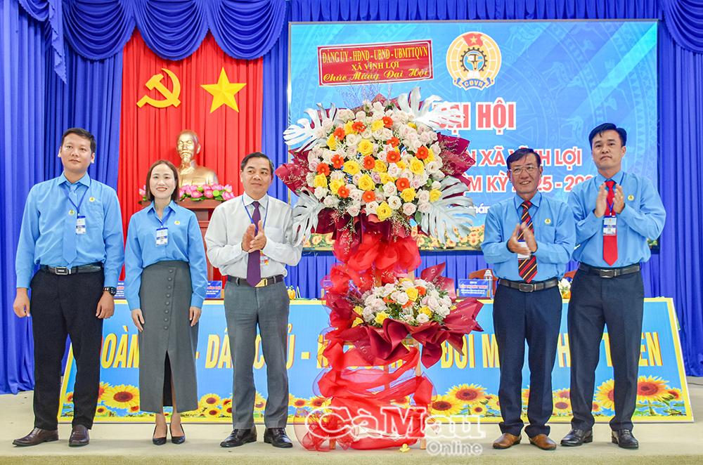 Đồng chí Huỳnh Út Mười, Chủ tịch LĐLĐ tỉnh Cà Mau, tặng hoa chúc mừng đại hội.