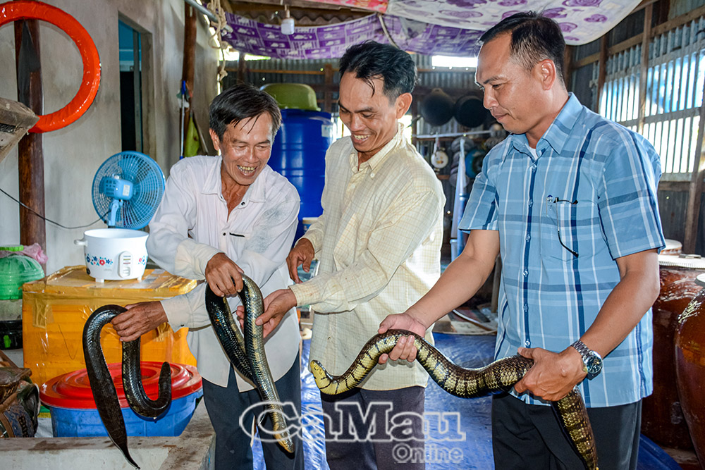Cán bộ xã tham quan mô hình nuôi rắn ri tượng của ông Dư Văn Út, ấp Chống Mỹ.