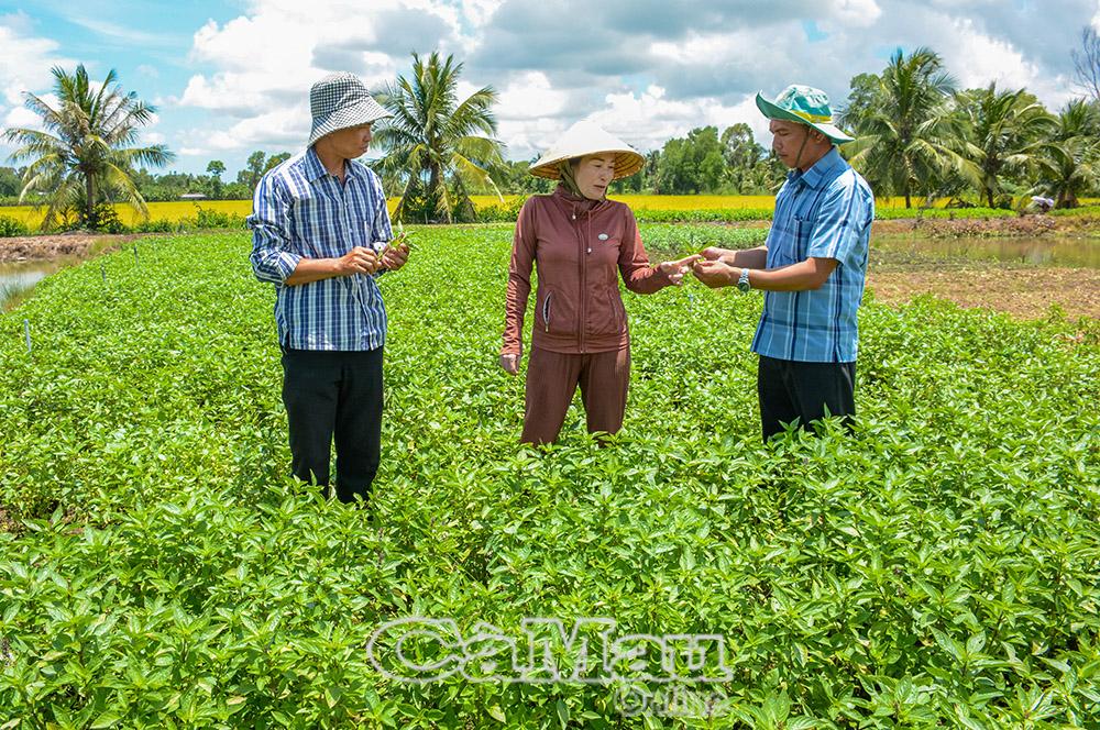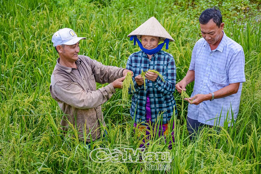 Ông Lê Minh Trí (bên phải), Trưởng ấp Kinh Hội, cùng người dân kiểm tra chất lượng cây lúa.