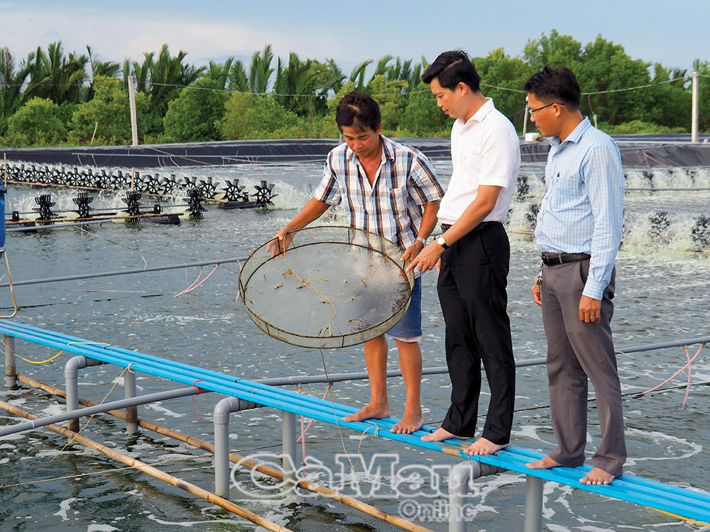 Ông Hồng Phương Tiện (giữa), Phó Bí thư, Chủ tịch UBND Xã Nguyễn Việt Khái tham quan mô hình nuôi tôm công nghiệp tại ấp Cái Bát.