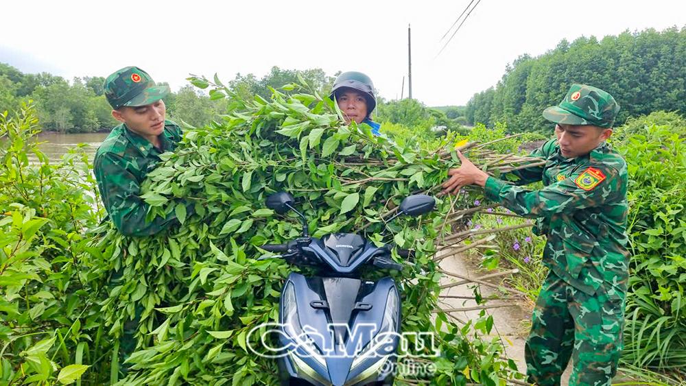 Cán bộ, chiến sĩ Đồn Biên phòng đóng trên địa bàn xã Tân Ân cùng chung tay dọn vệ sinh, trồng hoa, góp phần xây dựng môi trường nông thôn sạch, đẹp.