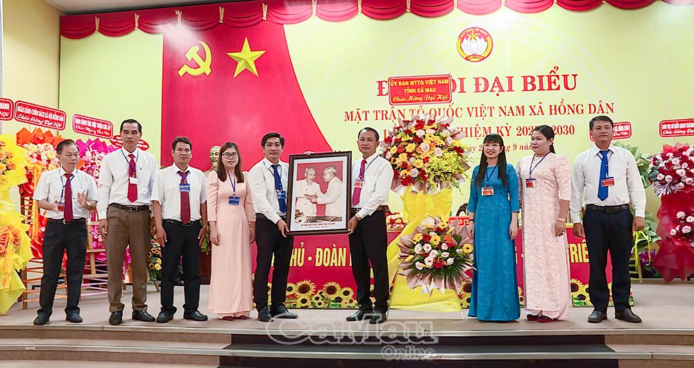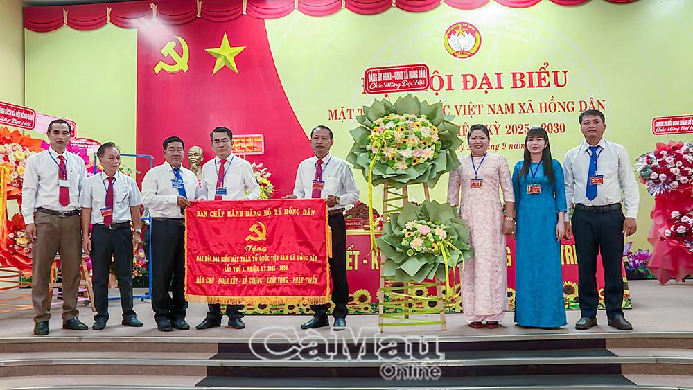 Đồng chí Hà Tấn Linh, Bí thư Đảng uỷ Hồng Dân (thứ tư, từ trái sang) tặng bức trướng “Dân chủ - Đoàn kết - Kỷ cương - Khát vọng - Phát triển” tặng đại hội.