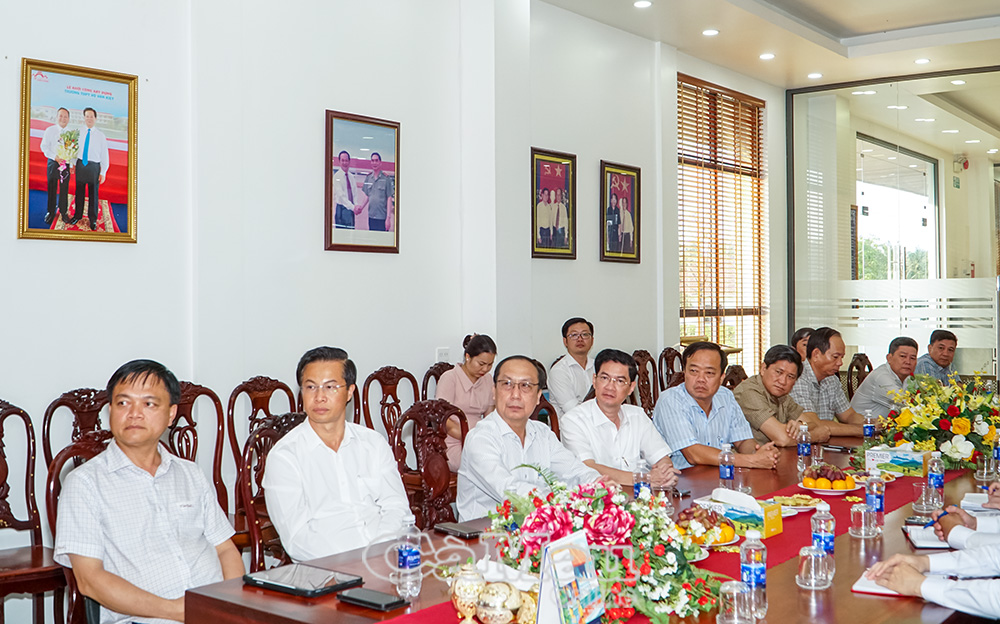 Đồng chí Huỳnh Quốc Việt, Phó Bí thư Thường trực Tỉnh uỷ (thứ 5, từ trái sang), cùng đoàn công tác nghe báo cáo của Công ty TNHH Phú Cường Kiên Cường về kết quả sản xuất kinh doanh.
