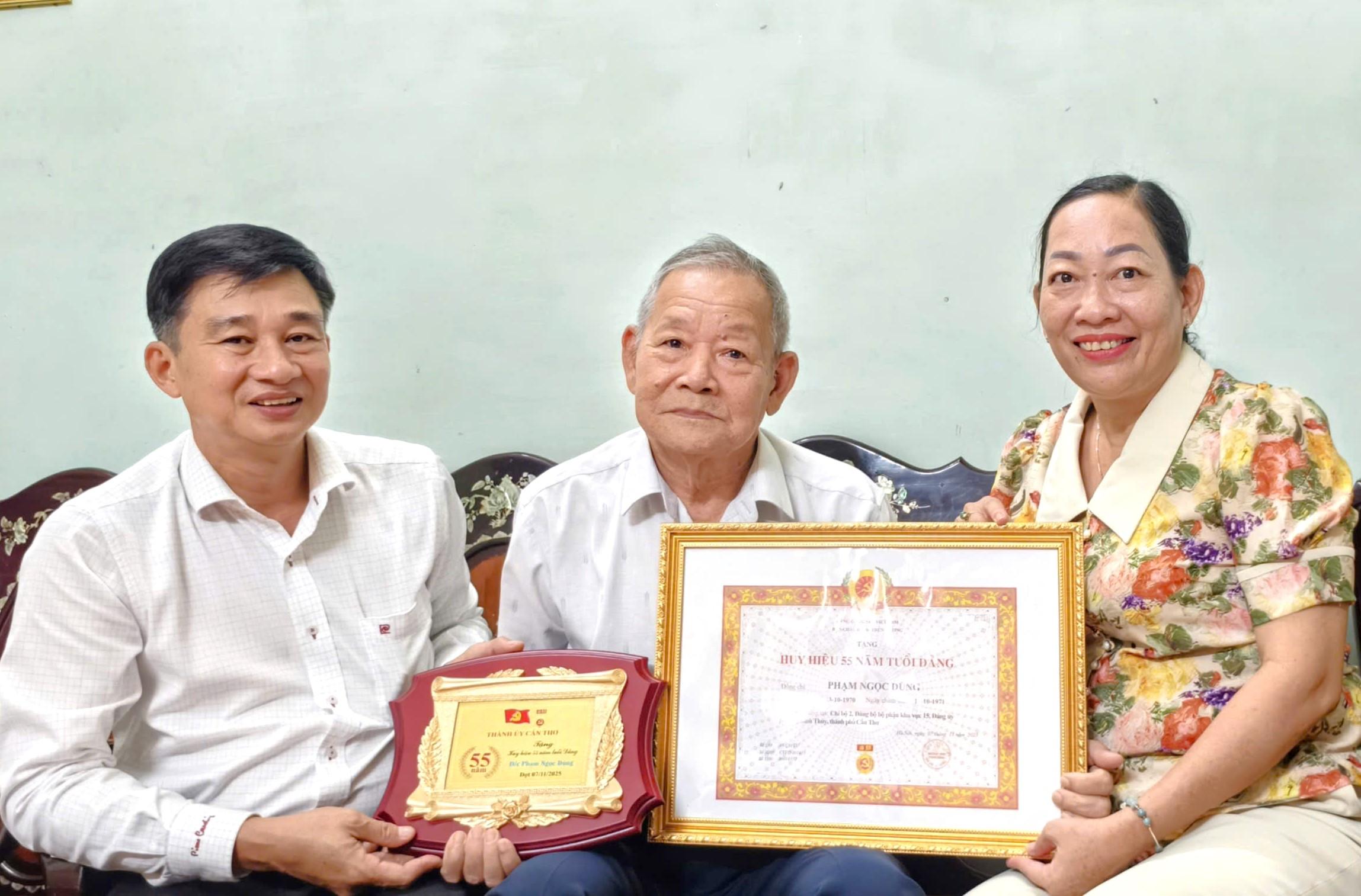 Đồng chí Phan Thị Nguyệt, Bí thư Đảng ủy, Chủ tịch Hội đồng nhân dân phường Bình Thủy và đồng chí Lê Phước Lợi, Phó Bí thư Thường trực Đảng ủy phường trao tặng Huy hiệu 55 năm tuổi Đảng cho đảng viên Phạm Ngọc Dũng. Ảnh: Nguyễn Tín.