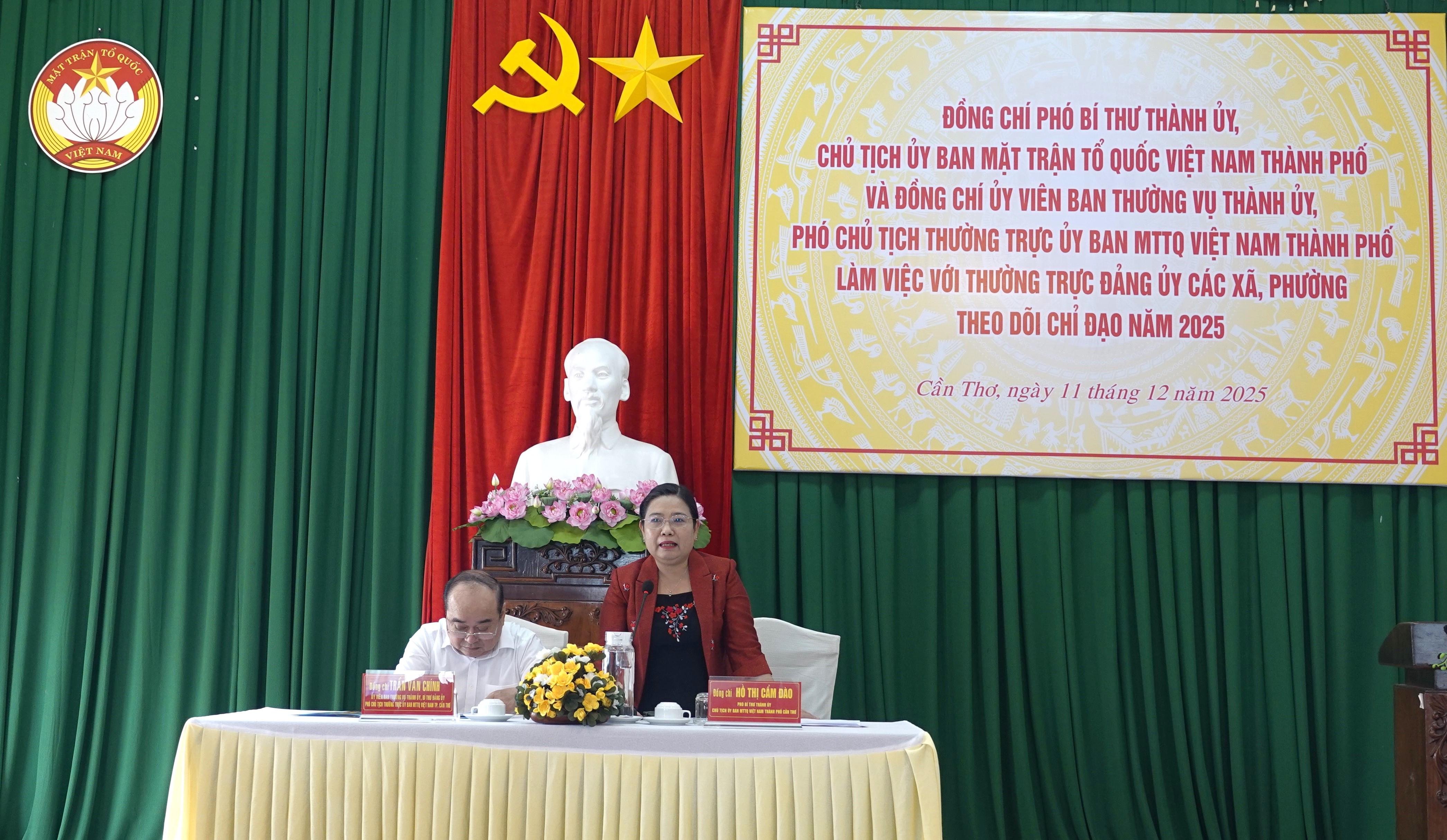 Ngày 11/12, bà Hồ Thị Cẩm Đào, Phó Bí thư Thành ủy, Chủ tịch Ủy ban MTTQVN TP Cần Thơ; ông Trần Văn Chính, Ủy viên Ban Thường vụ Thành ủy, Phó Chủ tịch Thường trực Ủy ban MTTQVN thành phố, làm việc với Thường trực Đảng ủy các phường: Long Bình, Long Mỹ, Long Phú 1, Hưng Phú, Thuận Hưng, Tân Lộc, Trung Nhứt và các xã: Vị Thủy, Vĩnh Tường, Thạnh Xuân, Xà Phiên, Vĩnh Trinh, Thạnh An, Thạnh Quới, Mỹ Quới, Vĩnh Lợi, Tân Long về kết quả thực hiện nhiệm vụ chính trị của các đảng bộ từ khi đi vào hoạt động từ ngày 1-7-2025.